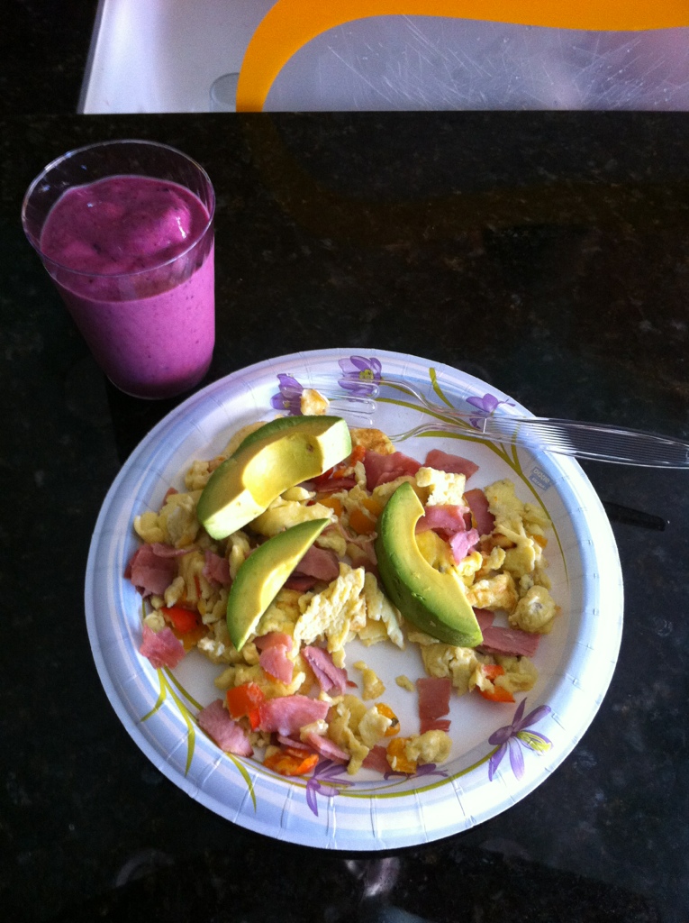 Chopped up the veggies and ham, threw them in the pan with some olive oil for a few mins. Whipped up the eggs in a separate bowl then added to the veggies. Heated up the ham in a separate pan for anyone who didn’t want ham. Sliced up the avocado and placed on top of the scramble. Serve and enjoy. It took all but less then 30 mins to make a meal for 4-6 people.